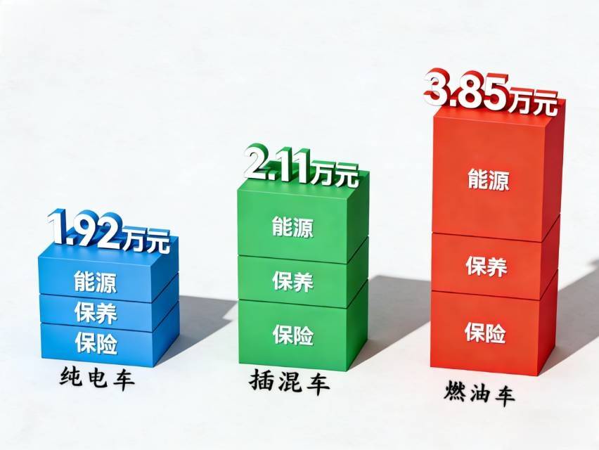 传统燃油车:油费19000元 + 保养费4000元 + 保险费及车船税约15500元 ≈ 3.85万元(以上为便于比较的粗略估算,具体因人、因地、因车而异)