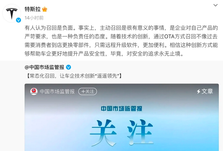 召回160万辆存安全隐患车型后,特斯拉回应:召回并非负面