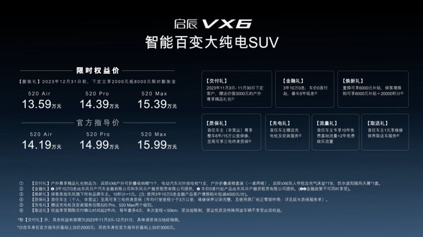 11月3日,2023年启辰品牌焕新暨秋季新品发布在广州顺利举行。启辰Vita原生纯电平台下全新车型智能百变大纯电SUV启辰VX6正式发售,指导价格为14.19万元-1...
