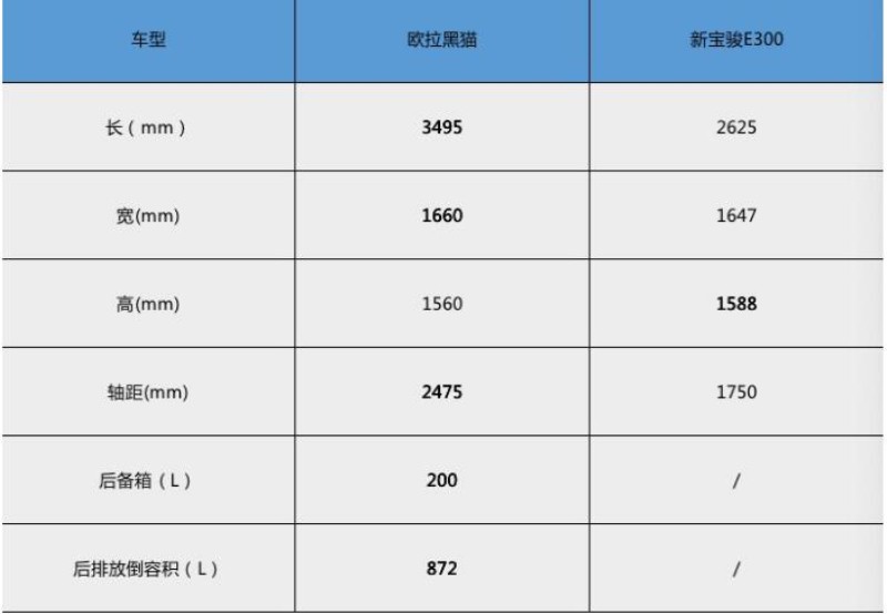 车身尺寸方面,新宝骏E300长宽高分别为2625mm*1647mm*1588mm,而欧拉黑猫的车身长度为3495mm。