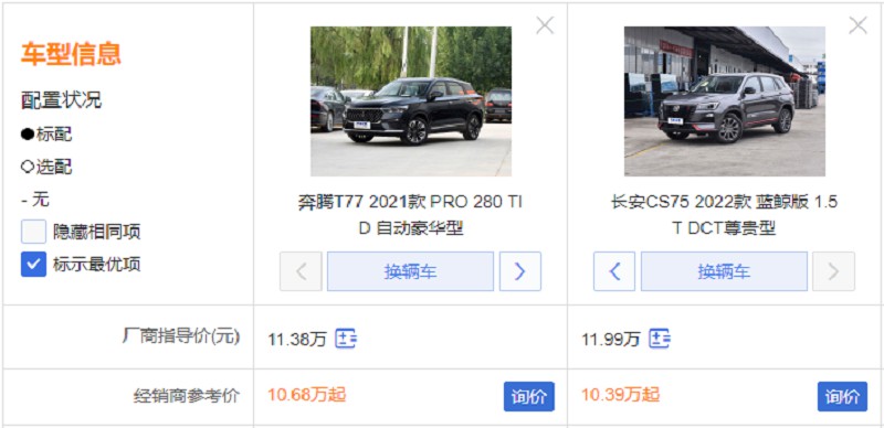 我们以奔腾T77 PRO 280 TID自动豪华型,和长安CS75 1.5T DCT尊贵型为例。