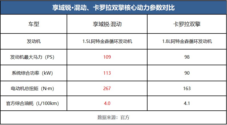 至于实现效果,大家不妨先看享域锐·混动和卡罗拉双擎的动力参数↓