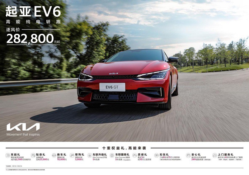 其中,起亚进口车EV6逐风价仅282,800元起,消费者购车可享:赠送家用充电桩或价值2,500元充电积分、至高21,000元金融贴息、10,000元置换补贴、3,000元的保客增购补贴、Kia Connect服务5年免费(不含爱奇艺)、Kia Connect升级5年免费、整车5年或10万公里质保、三电8年或15万公里质保(首任非营运车主动力电池终身质保)、首任车主终身免费24H道路救援(质保范围)、首任车主终身免费4项上门服务(养护、取送车、轮胎修补、代客充电)等十重权益礼。
