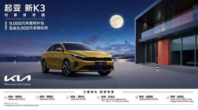 而作为起亚布局紧凑级家轿市场的战略车型,购买新K3可畅享包括9,000元购置税补贴、4,000元保险补贴、5,500元油费补贴、价值1,200元增值权益礼包、至高9,000元金融贴息、以及2,500元/台置换津贴(非置换1,000元/台津贴)等六重专享福利。