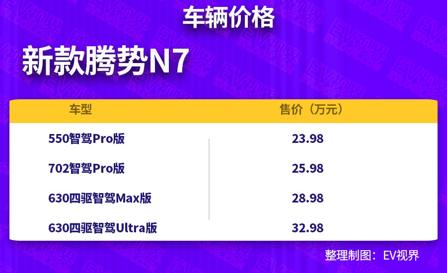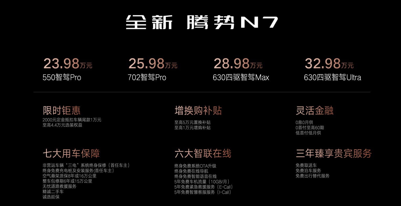 4月1日,新款腾势N7正式上市,新车共推出了4款车型,售价23.98-32.98万元。具体售价与用户权益如下:
