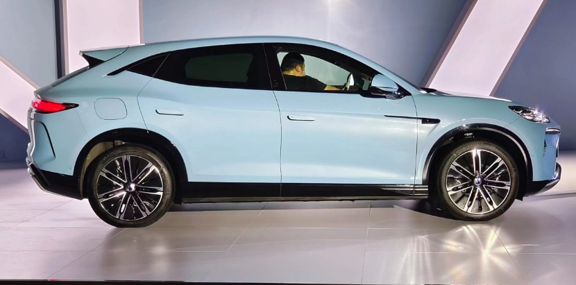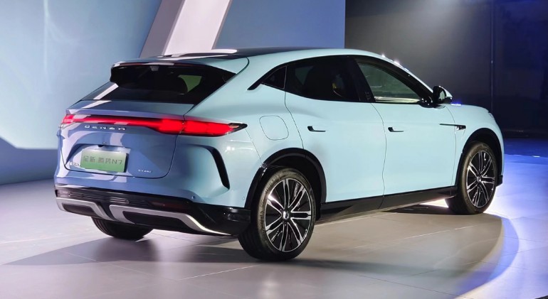 车身侧面,新车采用了溜背式轿跑SUV的车身结构,略向下倾斜的车顶线条让新车的动感效果得到提升。同时,该车整个侧面看起来十分简洁,双腰线的加入配合前后隆起的轮眉线条,进一步增加这款车的运动气息。值得一提的是,据官方表示,腾势N7的车顶是按照0.618:1黄金分割进行设计,从前挡风玻璃流 畅地过渡到占据长比例的车顶,从前到后非常流畅地延展,展示出优美的轮廓。