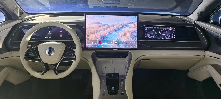 内饰方面,全新腾势 N7 配备6块屏幕,50英寸AR HUD、10.25英寸仪表盘、17.3英寸中控大屏、10.25英寸副驾娱乐屏、流媒体后视镜屏以及后排扶手屏。搭载DiLink 100智能座舱系统,配备6nm制程芯片、5G智能网联系统,拥有更流畅的使用体验。