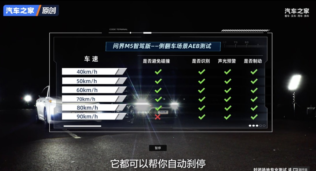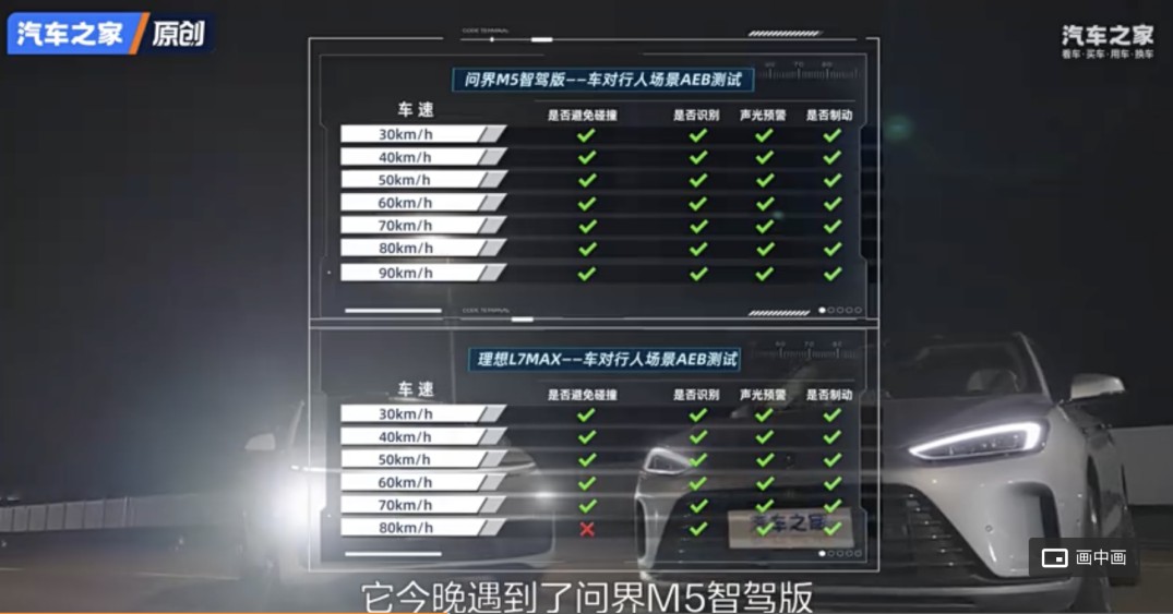 在车对行人场景测试中,面对突然有行人闯出的情境,即使时速高达90km/h,问界M5智驾版仍能可以及时检测并安全刹车。而理想L7 Max在这种紧急状况下的表现则略显不足,时速超过40km/h便无法应付。实际上,在夜间驾驶当中,常常会出现因光线不足或对向车辆的逆光干扰而无法及时捕捉路况的问题,而在这种环境下,问界M5智驾版感知硬件能够立体检测到潜在的危险,辅助系统快速作出反应,从而避免事故的发生,这也证明了该车在主动安全方面的可靠性。