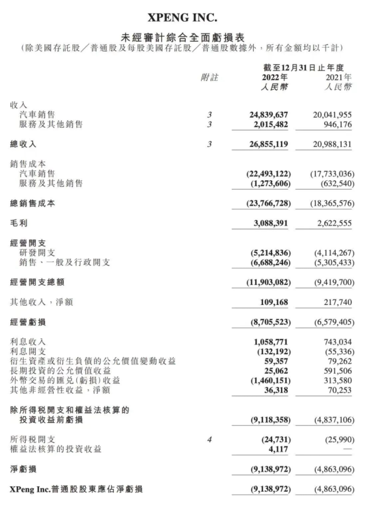 小鹏汽车2022年亏损91.4亿元,同比增长88.1%。每卖出一台车预计亏损7.6亿元。