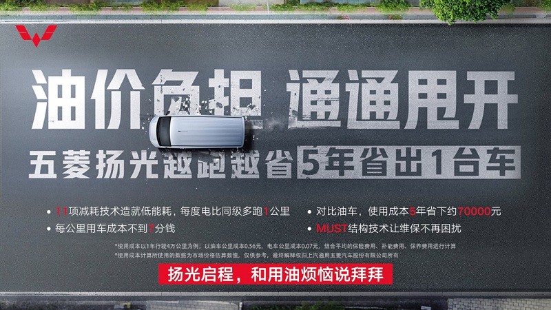 据测算,倘若用户每年驾驶五菱扬光行驶4万公里,对比油车五年可省下约70000元(测算按油车公里成本:7L/100km*8元/L=0.56元/公里;电车公里成本:0.5元/度,0.07元/公里,结合平均保险、补能及保养费用进行计算),相当于5年可省出一辆全新五菱扬光。