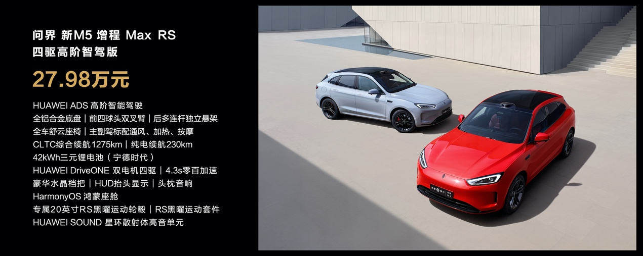 问界新M5系列售价和首销期权益已经公布——问界新M5增程Max后驱高阶智驾版24.98万、问界新M5纯电Max后驱高阶智驾版26.98万,问界新M5增程Max RS四驱高阶智驾版27.98万。即刻下定,可享受价值3.7万的选配权益,包括3000元现金优惠,赠送价值12000元选配金,赠送价值20000元城区智驾包等额抵扣券,提车后赠送价值2000元前挡风玻璃隔热膜,并将于5月15日开始批量交付。