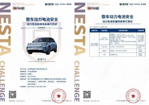 T1的极光电池安全同样“卷到极致”,延续极狐一贯的电池安全高标准,T1所采用的极光电池全面通过了新国标17项系统测试和6项关键测试,在“不起火、不爆炸”的基础上,“超纲”实现“无热扩散”,并且提前了一年。在中汽研主导的动力电池极端场景串行测试中,极狐T1成功完成350mm水下刮底、500m颠簸,300kN极限挤压,150s极限火烧三大挑战,成为首批获得动力电池新国标认证的汽车。