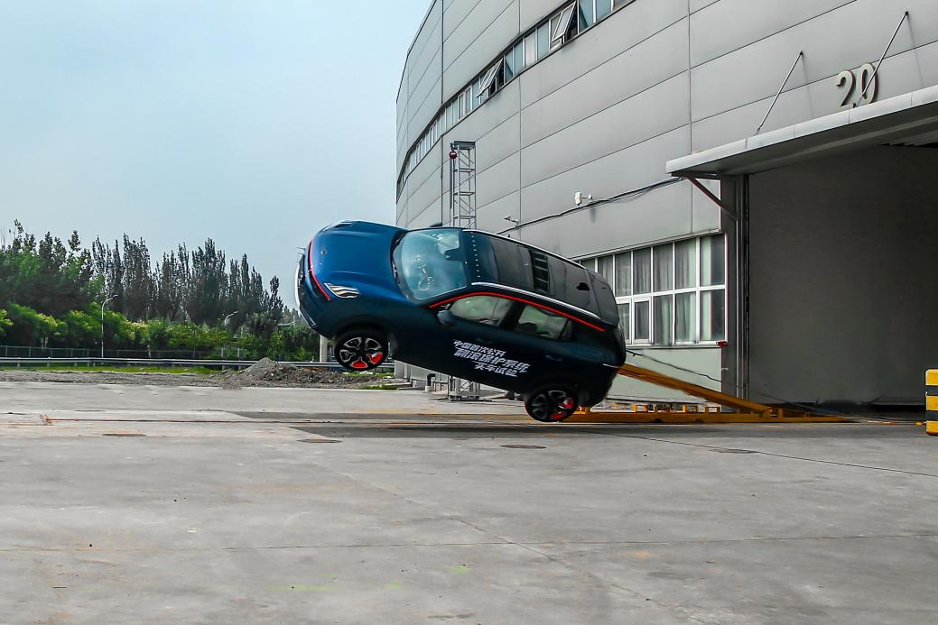 (领克06翻滚保护试验侧气帘凌空展开,及时保护)