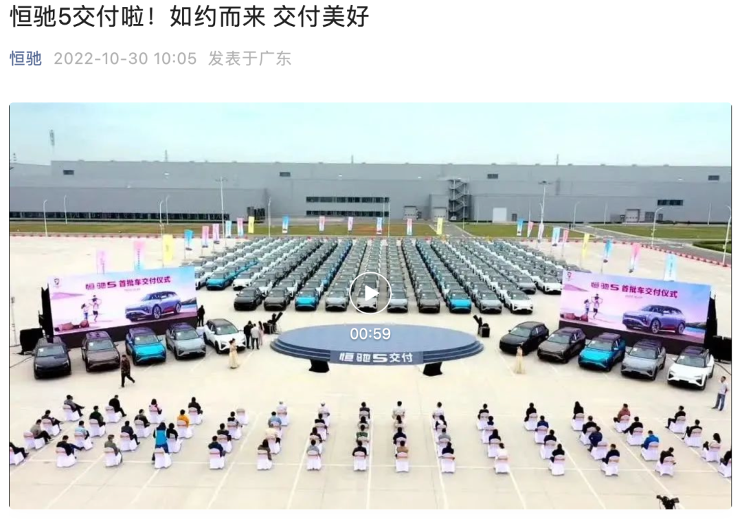 从时间线来看,恒驰5于8月10日正式上市,仅推出一款车型,售价为17.9万元。9月16日,恒驰5在天津工厂下线。10月29日,恒驰5开启交付,首批交付100台。
