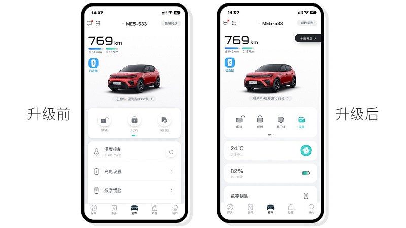 天际ME5发布的OTA2.0升级版本中,天际APP控车板块也同步升级了13项,主要体现在界面优化、控车功能增加等细节,如新增了剩余电量等体现车辆状态的显示功能,而多层次设计手法的应用使指令表达更加具体,操作指引性更强,列表化页面调整为卡片式设计,功能表达更加清晰,升级后界面整体更扁平化、更简洁。此外,在天际APP上还增加了报警场景,如若车窗未上锁,会在主页进行提示,并且通过控车功能可操作关闭车窗。