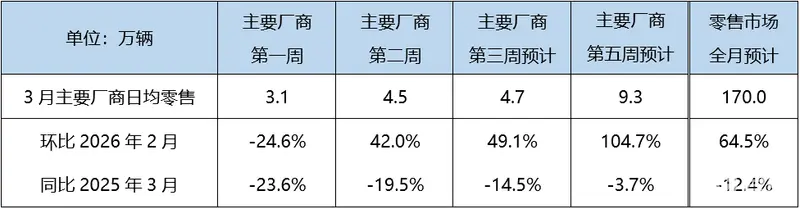 受春节假期影响,3月初车市开局疲软,第一周(乘联分会定义为1-8日)日均零售3.1万辆,同比下滑23.6%。第二周终端热度有所恢复,日均零售回升至4.5万辆,同比降幅收窄至19.5%。第三周,随着新车上市预热启动,预计日均零售可达4.7万辆,同比降幅继续收窄至14.5%;第四周(乘联分会定义为23-31日),在厂商季度末冲量以及新车到店放量的双重推动下,市场增长动力预计有所恢复,预计日均零售冲高至9.3万辆。综合预估全月零售市场可达170万,环比增长64.5%,同比下降12.4%。