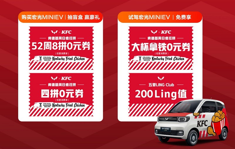 到店试驾或购买宏光MINIEV,抽盲盒,即可有机会赢价值7280元/张KFC 周日疯狂拼52周8拼0元券或四拼券,必得大杯拿铁券,更有超级锦鲤大礼包抽奖机会;下单肯德基“周日疯狂拼”即有机会赢宏光MINIEV。11月13日起连续四周每周日,五菱还将与肯德基打造联合直播间,联手重磅宠粉。