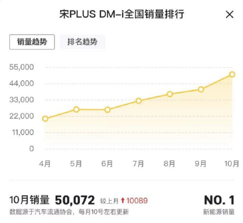 10月热销50072辆,比亚迪宋PLUS DM-i斩获PHEV和SUV双料冠军