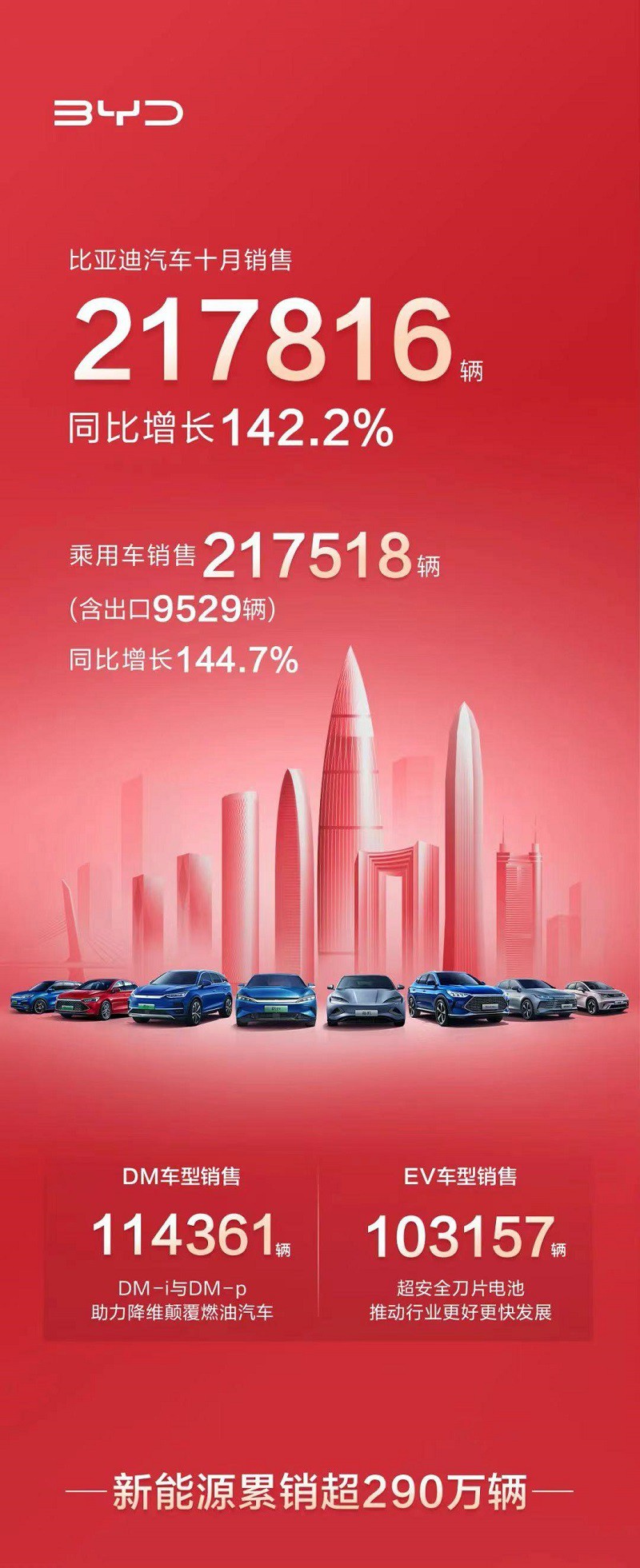 根据乘联会数据显示, 比亚迪10月销量名列国内车企榜首,创纪录地达到217816辆,同比涨幅142.2 %,全年累计销售接近140万辆,同比增长164 %,领跑百万级头部车企。其中,宋PLUS DM-i 在10月销量为50072辆, 较上月增长25 %,不仅首次实现单月销量破5万,还斩获了新能源和SUV两大品类的双料月度冠军。
