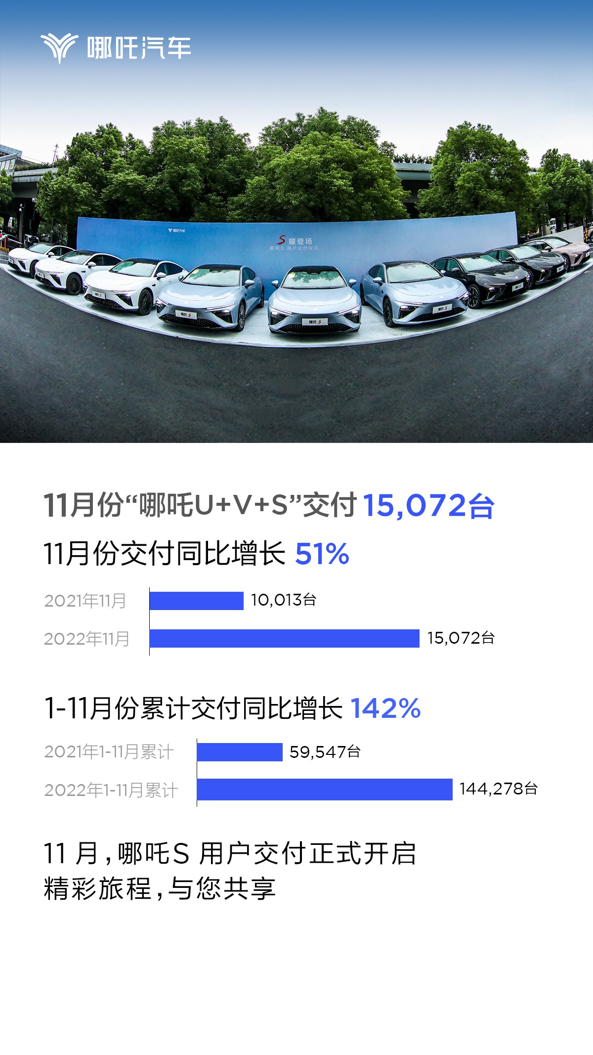 哪吒汽车保持着高增长态势,11月交付15072台,单月同比增长51%,实现了连续29个月的同比增长;2022年1-11月累计交付144278台,同比增长142%。