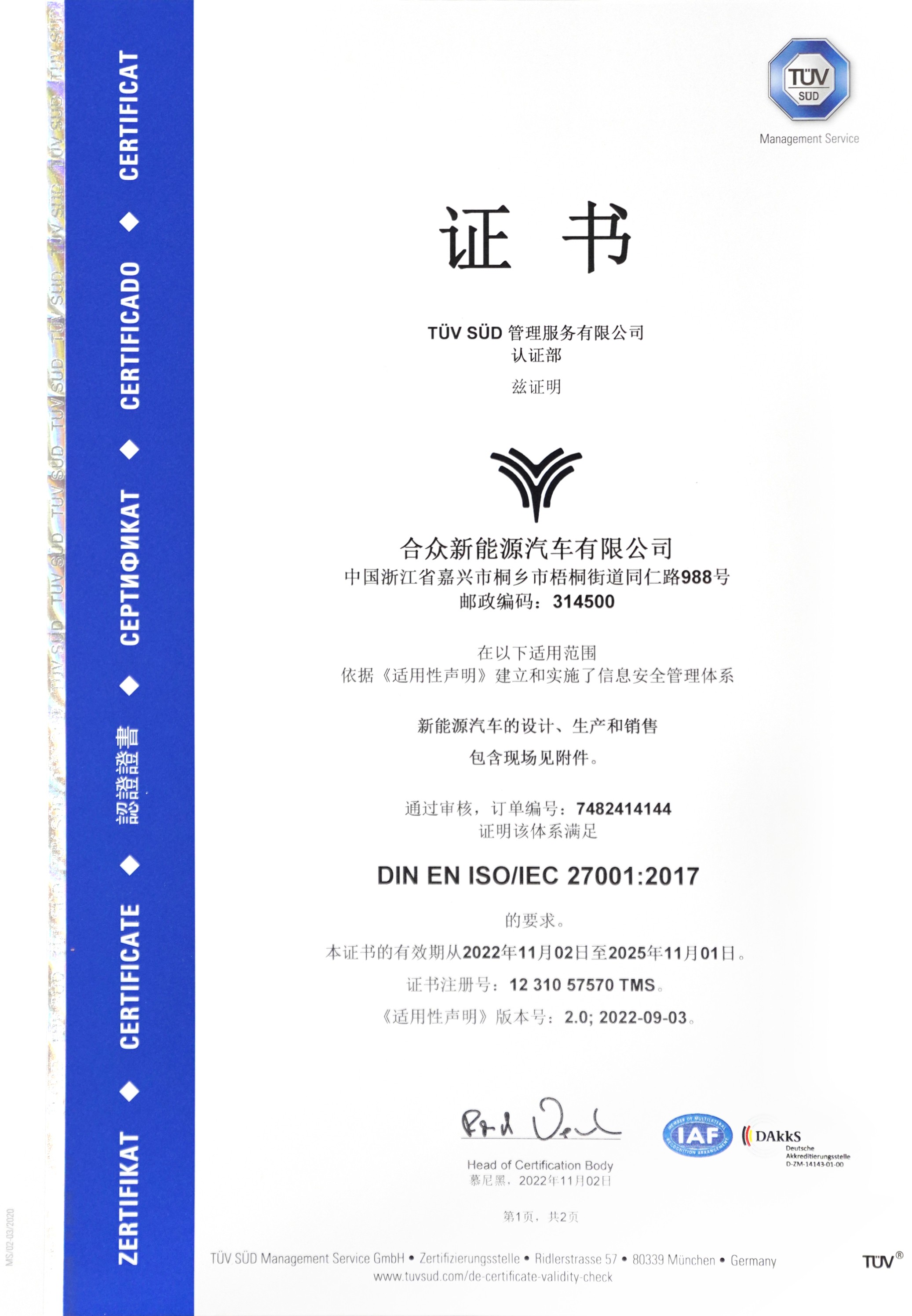 11月,哪吒汽车获全球知名检测认证机构南德意志集团颁发的ISO 27001管理体系认证证书(经德国认可委员会DAkkS认可)。