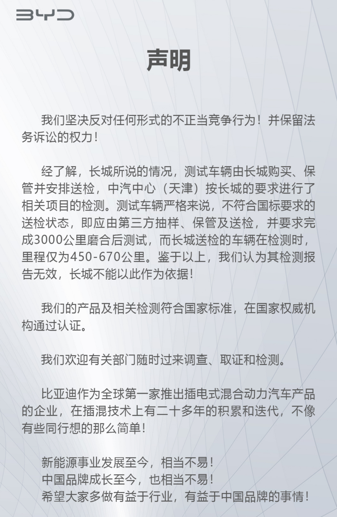 针对长城汽车的声明,比亚迪官方也很快给出回应:“我们坚决反对任何形式的不正当竞争行为,并保留法务诉讼的权力!”比亚迪认为,长城的检测报告无效,不能以此作为依据,其产品及相关检测符合国家标准,在国家权威机构通过认证。比亚迪表示,“作为全球第一家推出插混产品的企业,在插混技术上有二十多年的积累和迭代,不像有些同行想的那么简单,希望大家多做有益于行业和中国品牌的事情。”在这份声明里,比亚迪一连用了7个“感叹号”!