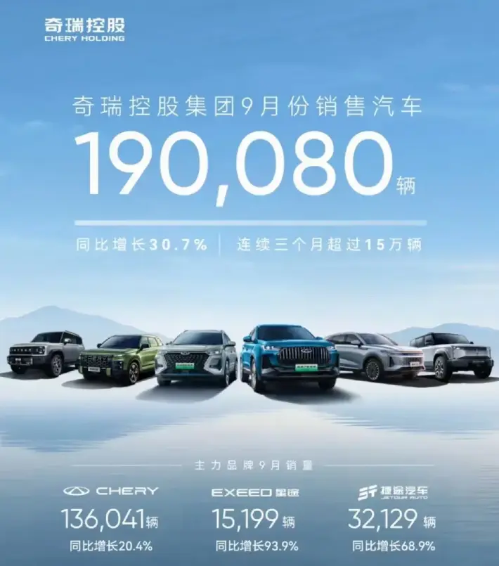 奇瑞集团9月市场表现强势,销量达190080辆,同比增长30.7%,连续3个月销量超15万辆,创奇瑞集团历史新高,接下来大有要迈进20万辆大关,成为今年除去比亚迪汽车销量增长较快的车企。