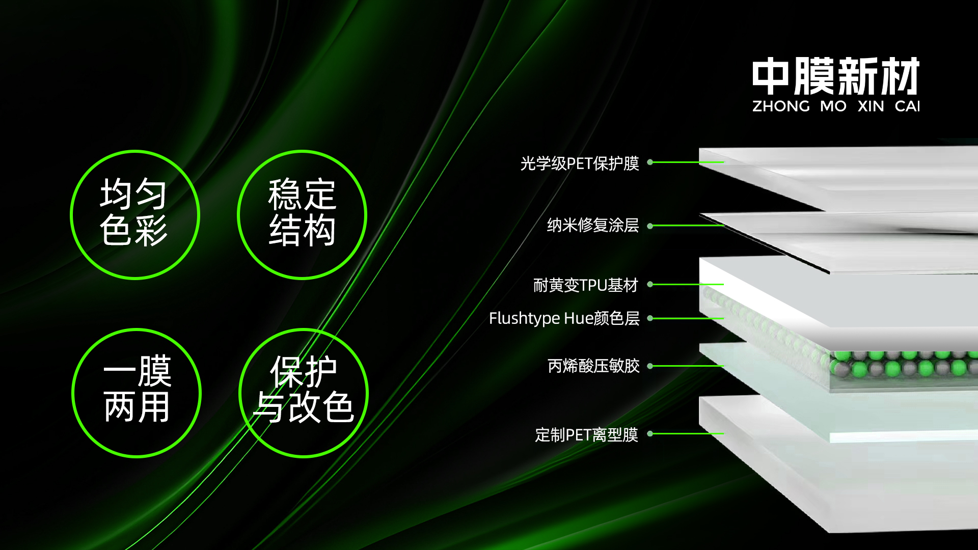 中膜新材的彩色车衣从功能上打破了改色膜的性能困局,通过采用全球顶尖TPU原料为基材,平衡分层结构,用内添加纳米陶瓷颜料方式,结合多层共挤一体成型技术,将色彩完美融入基材,融改色和保护两大功能为一体,彻底改变了传统改色膜的易褪色、难施工、色彩不均衡、耐候性差、无保护性能等不足。