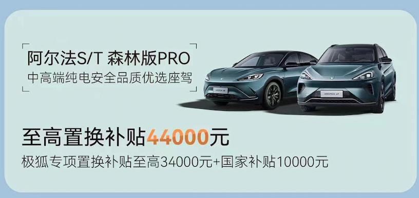 阿尔法S/阿尔法T森林版PRO,置换补贴最高达4.4万元,折合16.58万和16.18万元,就能够入手“中高端纯电安全品质优选座驾”。