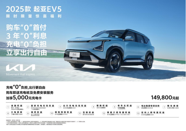 凭借高效可靠的三电系统、同级超长续航里程、灵活实用的百变空间、越级智能科技配置等优势,起亚EV5深受全球用户的认可,现已出口至澳大利亚、新西兰、智利、哥伦比亚等全球主流市场。值得关注的是,2025款EV5增配不加价,起售价为149,800元,购车还可享0首付、3年0利率、送充电桩及免费安装服务(价值4,000元)、5,000元充电卡、7,000元增换补贴、赠2年交强险(2,600元/2年)、悦达集团5,000元购车抵扣券、整车5年或10万公里质保、三电8年或15万公里质保等13项权益,综合优惠最高可达5.1万元,堪称“最具质价比的合资SUV”。
