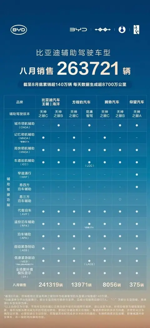 销量的持续增长,背后是强大技术实力与产品的支撑。近年来,比亚迪“技术护城河”持续拓宽。年初发布的“天神之眼”辅助驾驶系统,搭载车型累计销量已超140万辆,8月辅助驾驶车型国内销量占比达90%,每天生成的辅助驾驶数据里程超8700万公里。